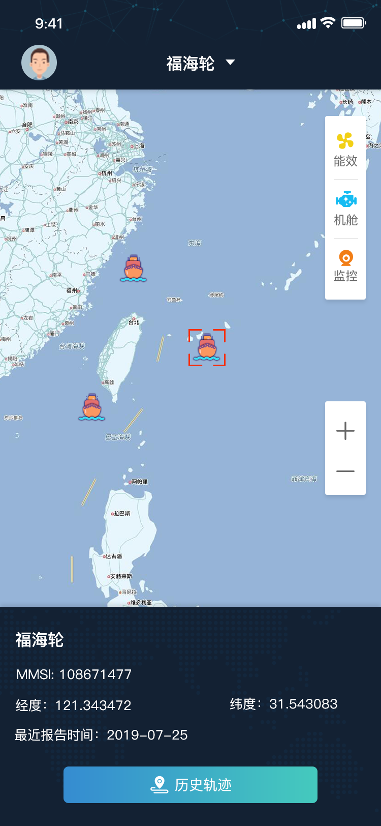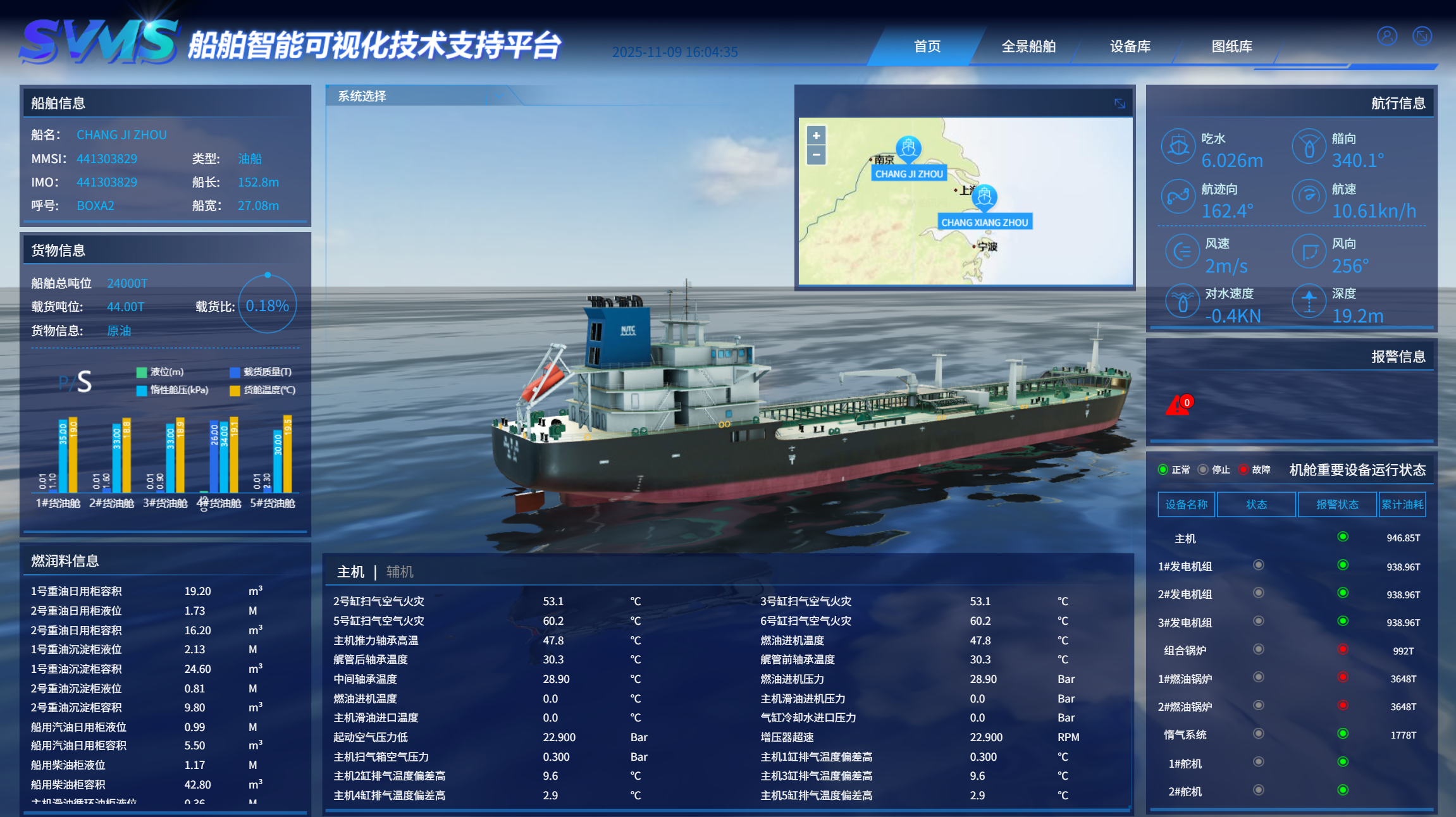 智能化船舶监测监控系统:以数字孪生的方式对船舶进行智能化管理,可以监控船舶的定位信息、主机运行状态、燃油能效状态、船舶机舱状态等,通过数据分析可以提高设备及船舶营运的安全,优化船舶航行控制燃油消耗,降低成本,提高收益等。